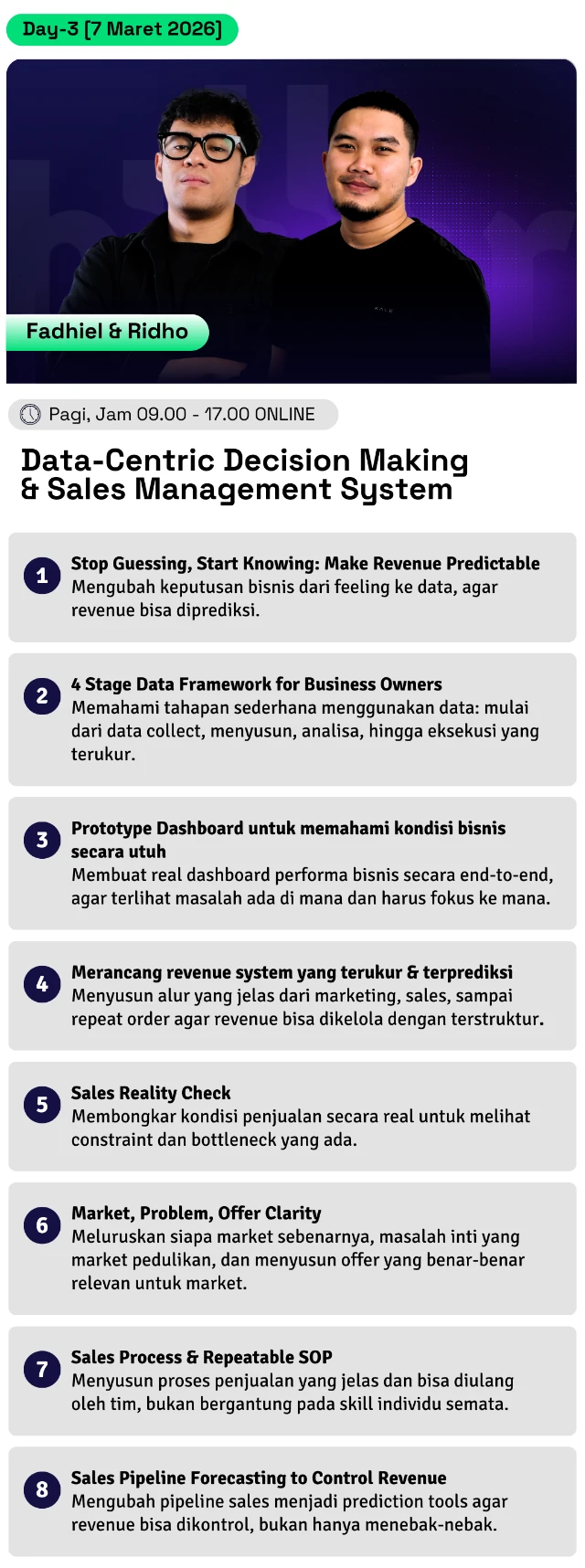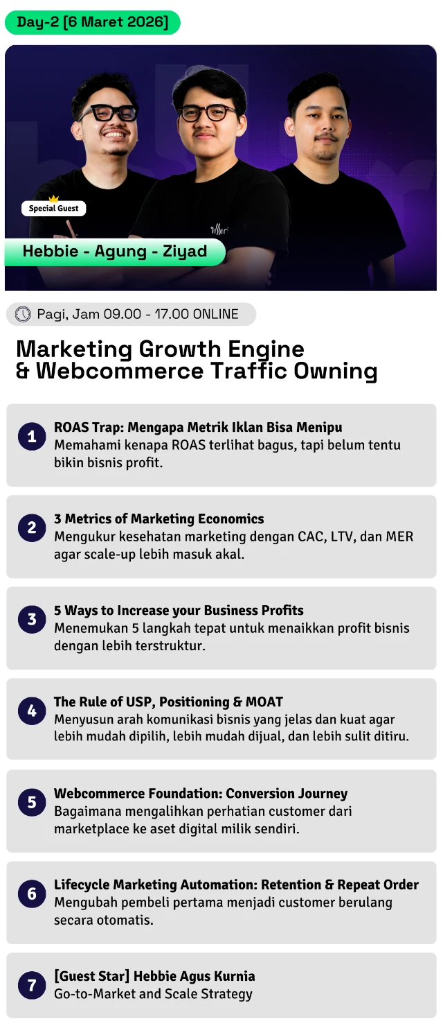Memahami marketing yang beneran ngaruh ke revenue, bukan cuma rame di laporan, nggak cuma lihat klik & ROAS, tapi jelas dampaknya ke omzet.