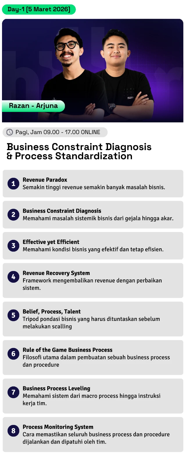 Program ini dirancang intensif dan tidak diulang dalam waktu dekat. Menunda berarti tetap menjalankan bisnis tanpa sistem revenue yang jelas.